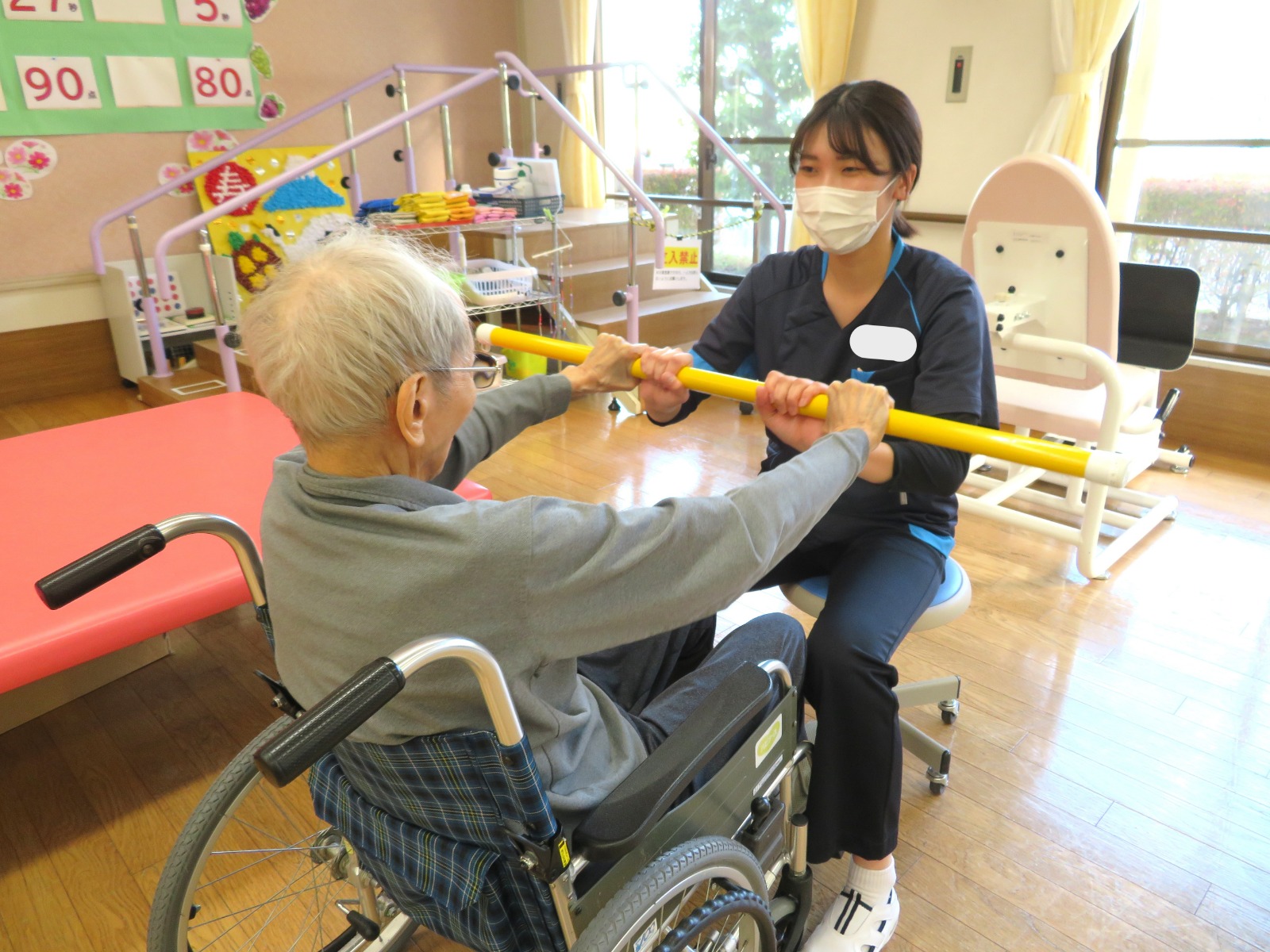 仕事としては、主にご利用者様の個別リハビリテーションを行っています。リハビリの内容としては、日常生活動作訓練や歩行訓練などの機能訓練、創作などの作業活動など行っています。
